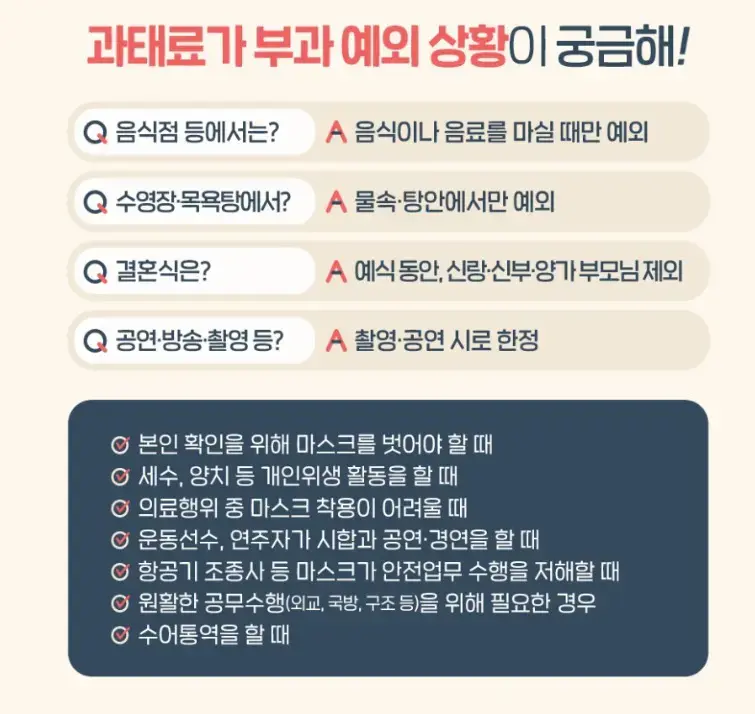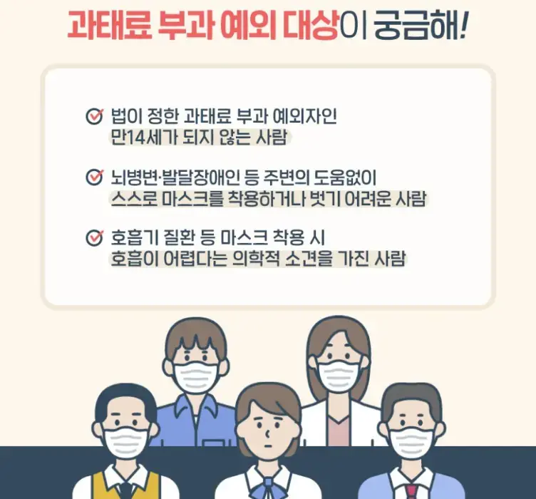 예외자 : 만 14세가 되지 않은 사람 / 뇌병변‧발달장애인 등 주변의 도움 없이 스스로 마스크를 착용하거나 벗기 어려운 사람 / 호흡기 질환 등 마스크 착용 시 호흡이 어렵다는 의학적 소견을 가진 사람