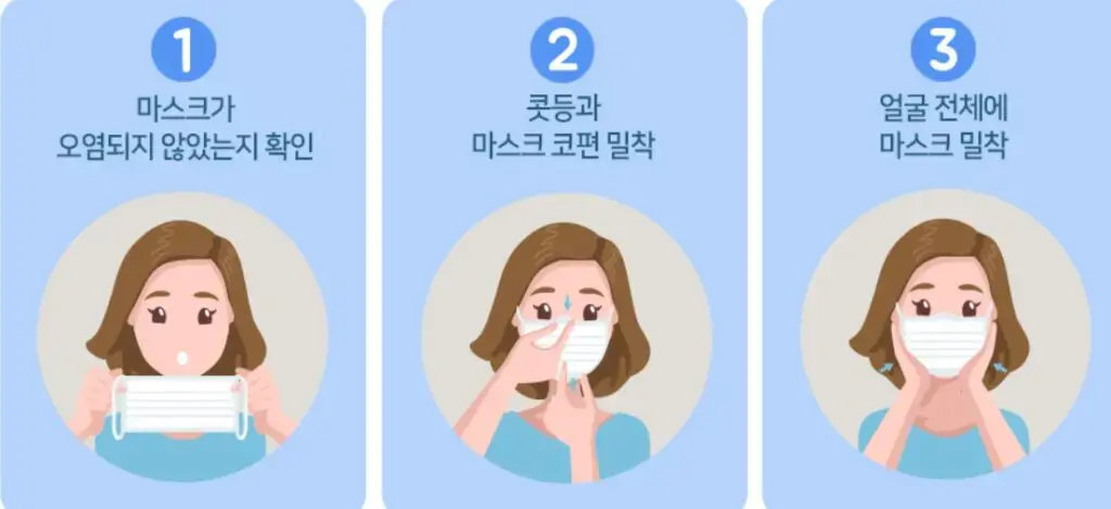 개인의 얼굴 크기에 맞는 적당한 마스크를 선택하여 호흡기인 코와 입을 완전히 덮도록 얼굴에 잘 밀착해 착용합니다./ 마스크 자체가 오염되지 않도록 마스크를 만지기 전에 손을 깨끗이 씻습니다. / 마스크 착용 시에는 손을 통한 오염을 방지하기 위하여 마스크를 최대한 만지지 않습니다. 만졌다면, 30초 이상 비누로 손을 씻거나 손 소독제로 손을 깨끗이 해야 합니다. / 마스크 사용 후에는 마스크 앞면에 손을 대지 않고 벗습니다. 보건용 마스크의 경우 아무 곳에나 두지 말고 즉시 쓰레기통에 버리고 손을 씻습니다. 면 마스크의 경우 제품 특성에 맞는 방법으로 자주 세탁합니다. / 마스크 내부에 휴지나 수건을 덧대면 공기가 새거나 밀착력이 떨어져 차단 효과가 낮아지므로 주의해야 합니다. / 오염 우려가 적은 곳에서 일시적으로 사용하는 경우 동일인에 한하여 재사용하실 수 있습니다.