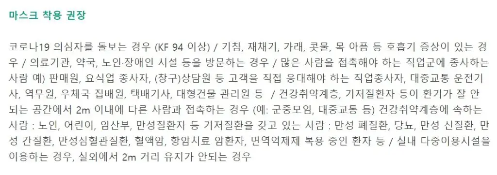 거리를 유지할 수 있는 야외에서나 사람을 만나지 않을 경우 착용을 권고하지 않습니다. / 24개월 미만의 유아, 주변의 도움 없이 스스로 마스크를 제거하기 어려운 사람, 마스크 착용 시 호흡이 어려운 사람은 마스크 착용을 하지 않습니다.