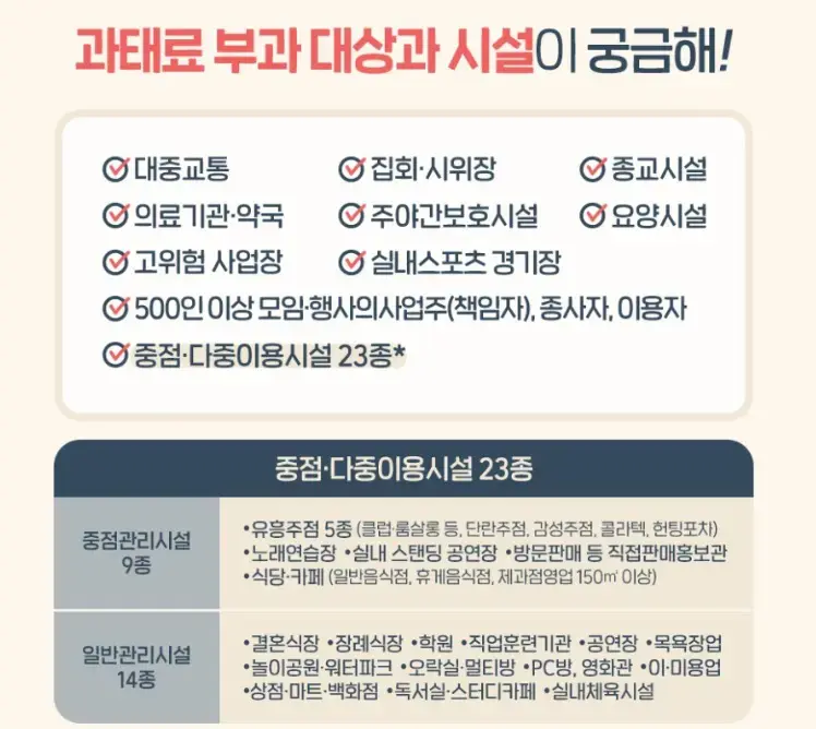 사회적 거리두기 조치에 따른 중점·일반관리시설의 관리자(운영자)·이용자/ 대중교통 버스‧지하철‧택시 등 대중교통의 이용자 / 집회·시위장 다중이 군집하는 집회의 관리자(주최자)‧이용자(참석자) /의료기관·약국 의료기관·약국의 관리자(운영자)·이용자 /요양시설, 주·야간보호시설 입소자·이용자를 돌보는 관리자(운영자)·종사자 /종교시설 종교시설의 관리자(운영자)·이용자 / 실내 스포츠 경기장 실내 스포츠 경기장의 관리자(운영자)·이용자 /고위험 사업장 고위험 사업장(콜센터, 유통물류센터)의 관리자(운영자)·이용자 / 지자체 신고·협의된 500인 이상 모임·행사 지자체 신고·협의된 500인 이상 모임·행사의 관리자(주최자)·이용자(참석자)
