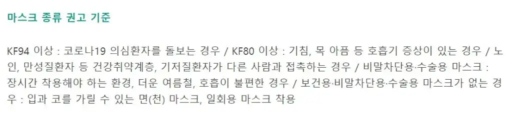 마스크 착용보다 손 씻기, 사람 간의 거리 두기 등이 코로나 19 감염 예방에 더 효과적이며 중요합니다. / 마스크는 침방울을 통한 감염 전파를 차단하는 효과가 있습니다. / 감염 위험이 있는 경우, 기저질환이 있는 고위험군에는 보건용·수술용 마스크 착용을 권장하며, 보건용·수술용 마스크가 없을 경우 면 마스크 착용도 도움이 됩니다.