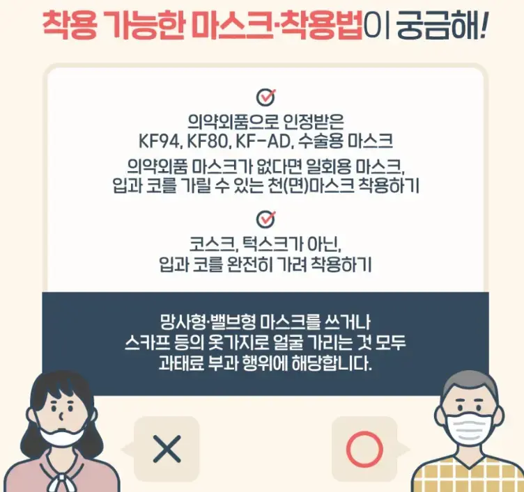 11월 13일부터 적발 시 10만 원 과태료 부과됩니다. 다중이용시설 및 대중교통/ 집회/ 의료시설 등 마스크 착용 의무화하고 있습니다. 망사/ 밸브형 마스크/ 스카프 옷가지 등 인정 불가이며 코스크 턱스크 등 입과 코를 가리지 않으면 과태료 부과됩니다.
