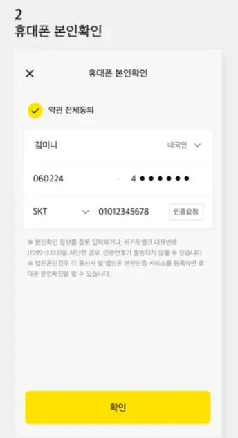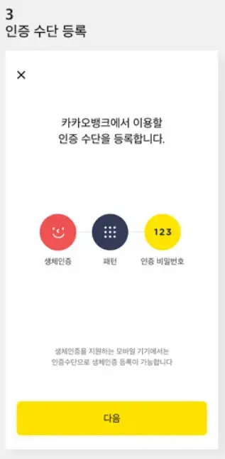 카카오뱅크앱을 다운 - 홈 화면 미니 만들기 버튼 클릭 - 휴대폰 본인 확인 인증 수단 등록 - 약관 동의 후 인증을 마무리 - 개설